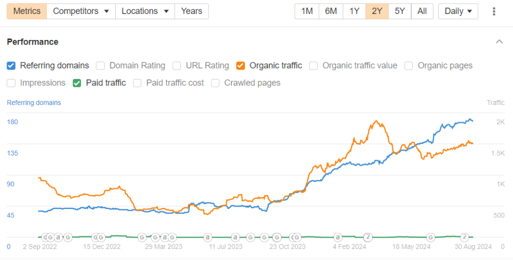 Traffic volume has increased substantially, from 958 organic visitors to 1.5K visitors. This is a direct result of link-building, as the client is receiving more traffic from referral sites and higher placement in the SERPs.